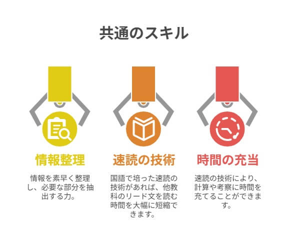 これらすべての教科に共通して必要なのが、情報を素早く整理し、必要な部分を抽出する力。国語で培った速読の技術があれば、他教科のリード文を読む時間を大幅に短縮でき、その分を計算や考察に充てることができます。