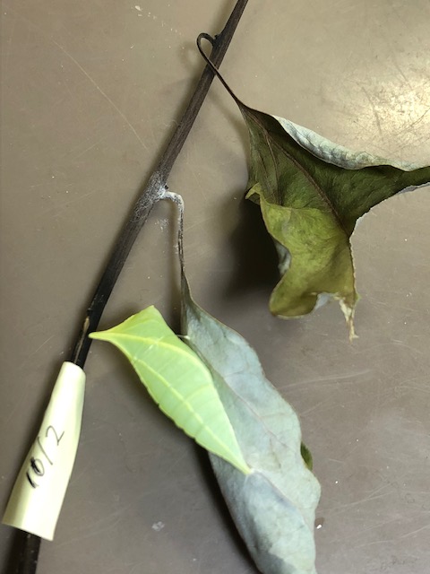 うちのアオスジアゲハはこのようにビン刺し(切り枝)で蛹化します。