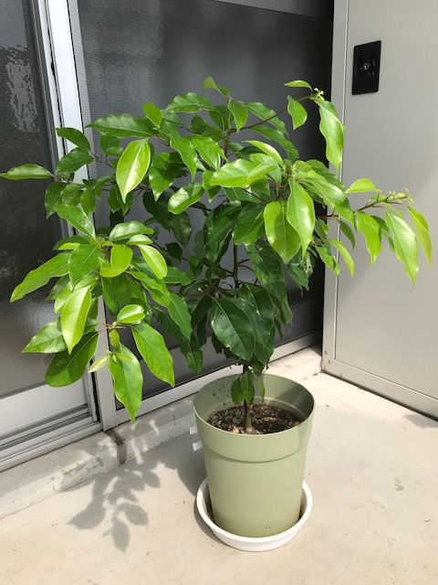 近所の歩道に生えていたひこばえの鉢植え。当初20cm程度だった木が、1年で40~50cmになりました。