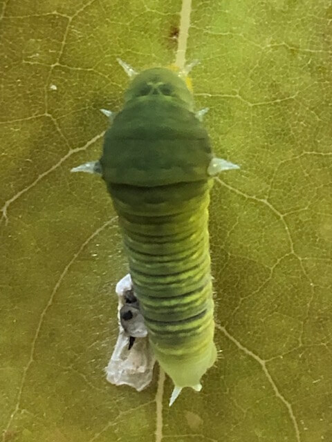 幼虫はほぼ糞を出し切ると、ワンダリング(蛹化の場所探し)を始めますが、他のアゲハチョウのように食草を離れて動き回ることはあまりありません。