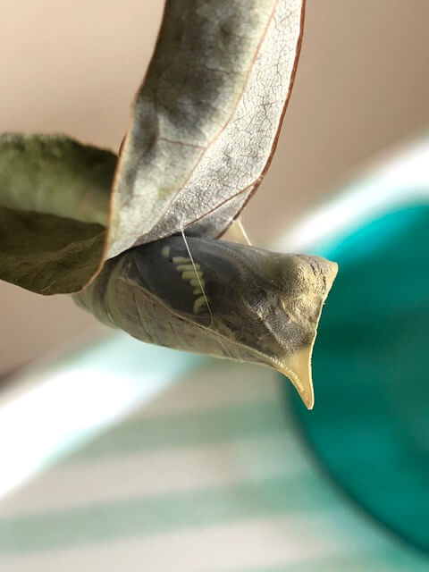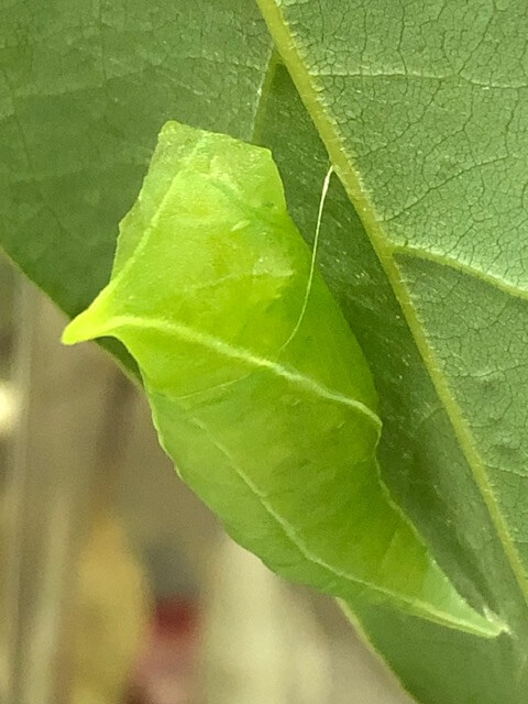 通常、蛹になる場所は食草の葉っぱの裏側。たまに、表側に張りつくこともあります。