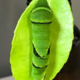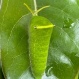 見事な擬態でクスノキの葉っぱに紛れ込む蛹からは、想像できない大胆さ。なんと、ここで脱皮しました。