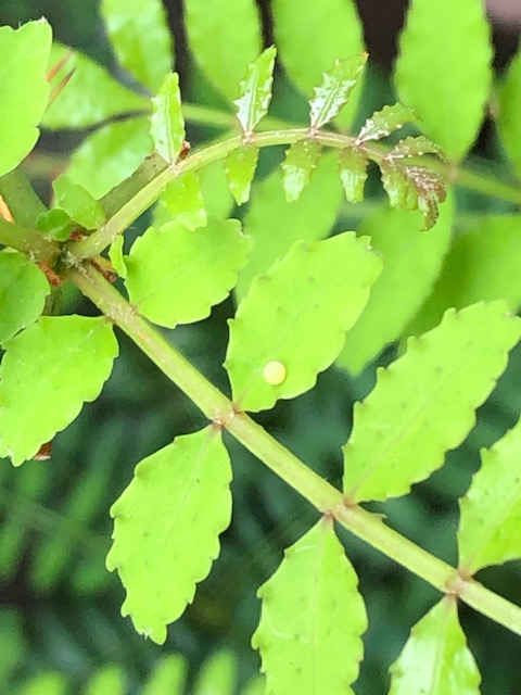 今季2度目のベランダ産卵。ナミアゲハが山椒に産んでいきました。