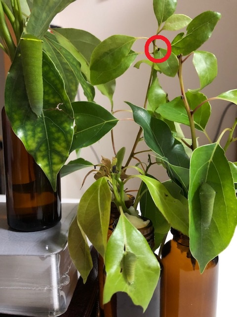 アオスジアゲハの幼虫は2齢になると、終齢と同じ形になります。ただ、小さいうちは上半身がぷくっと膨らんでいるので、我が家では「しゃもじ型」と呼んでいます。