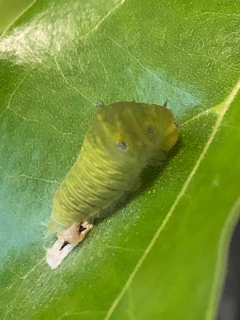 前回の日誌 に書いた貴重なアオスジアゲハの卵2つと幼虫1匹。