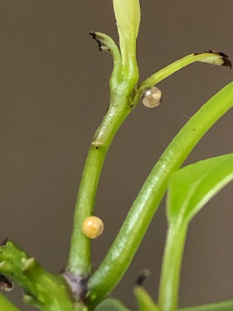 アゲハの卵は孵化が近づくと黒ずんできますが、それとは違う空疎な黒ずみ。おそらく死んでいます。
