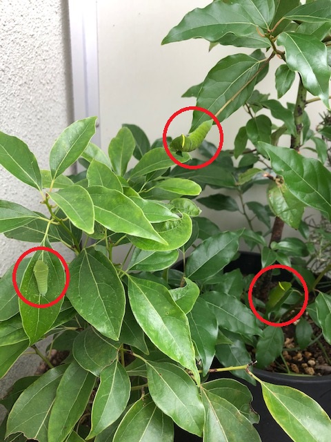 アオスジアゲハの幼虫はベランダのクスノキに移しました。