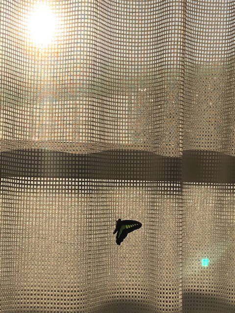 夜は壁か天井にとまって眠っていますが、朝ベランダ窓のカーテンを開けると、飛んできてレースのカーテンにずっと留まっています。
