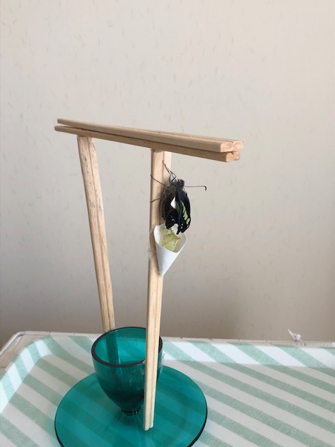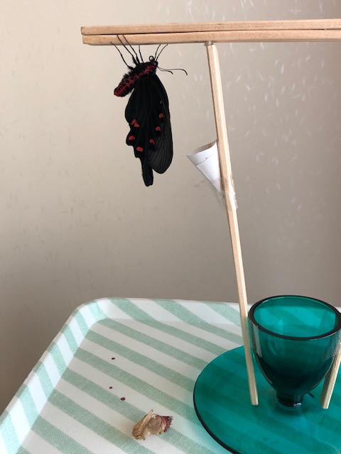 これまで羽化したジャコウアゲハは4頭ですが、例外なく脱け殻が下に落ちていることに気がつきました。
