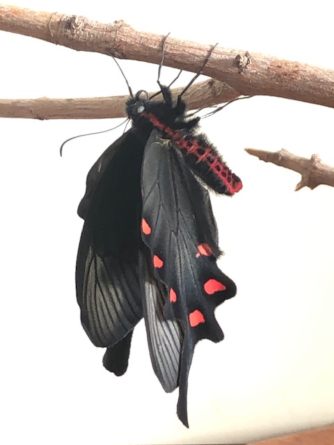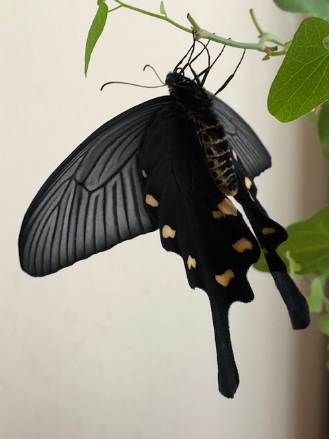 ジャコウアゲハは壁で蛹化するイメージが強かったので、虫かごやダンボール箱に閉じ込めたのですが、なかなか決まらず。