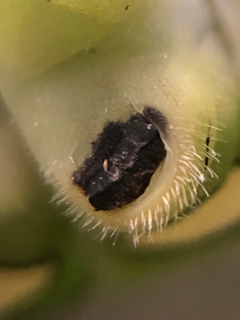 若齢幼虫がこのような黒っぽい色で、終齢幼虫は緑色。黒から緑に変化します。