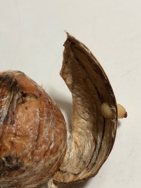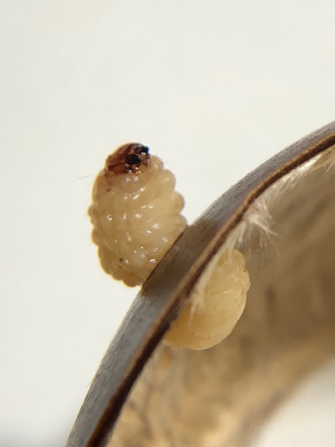 お馴染みヤドリバエの幼虫と似た色ですが、ちゃんと頭が識別できます。