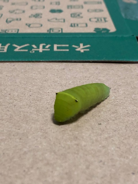 日曜日の朝。ダンボールのふたを開けたら、クロアゲハの幼虫が壁に張り付いていました。
