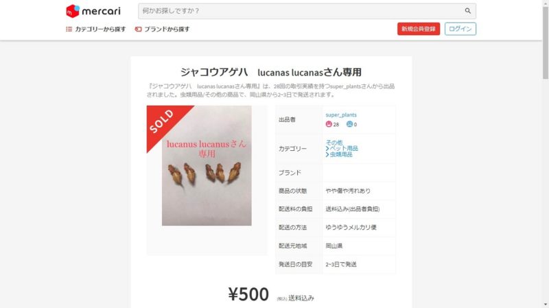 メルカリでジャコウアゲハの蛹5匹500円で、SOLDになっていました。