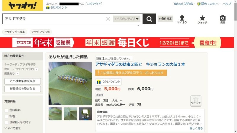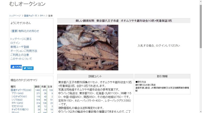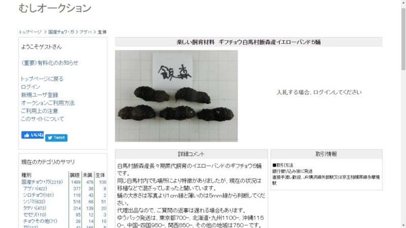 むしオークションはアカウントを作らないと、価格を見れないようです。