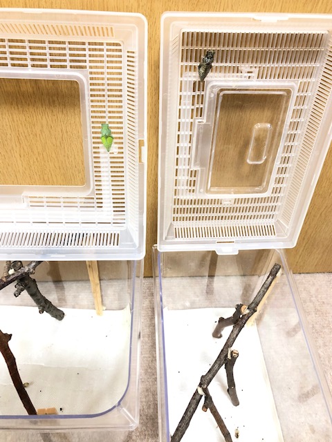 どちらも同じ日、同じ場所に置いてある同型の虫かごの蓋で蛹化。