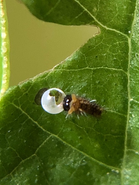 蛹もびちょびちょ。葉っぱにくっついてしまったので、こんなふうにぶら下げて乾かしました。
