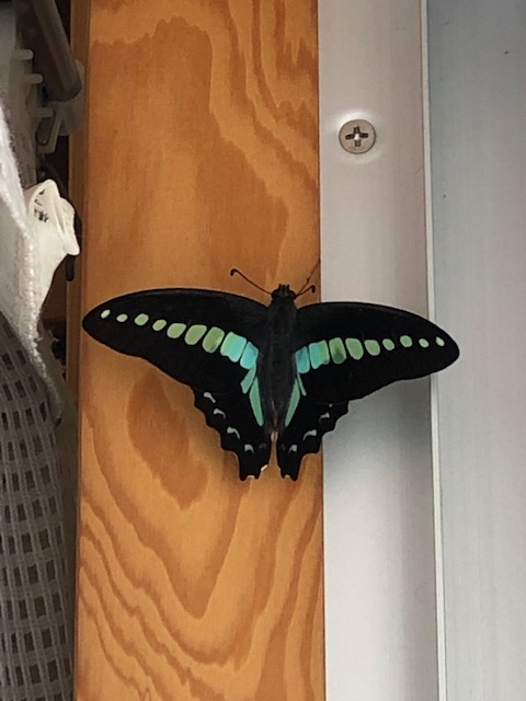 ふと台所の天井を見上げると、梁にアオスジアゲハがとまっていました。