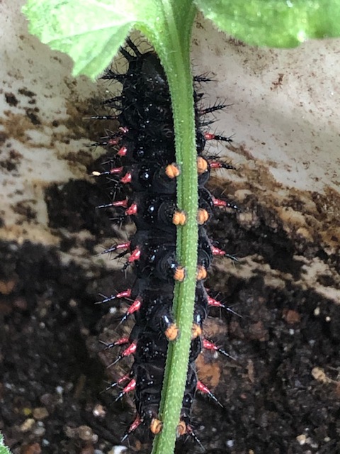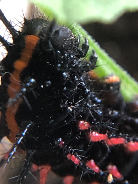 棘は赤、背中の太い線と腹脚はオレンジ色。目(単眼)は黒、識別困難です。