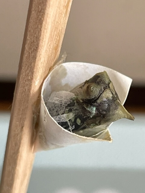 蛹の殻から体液が染み出たせいで、中が乾燥してしまったのかもしれません。
