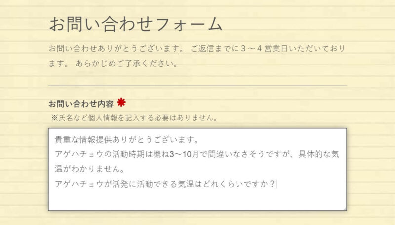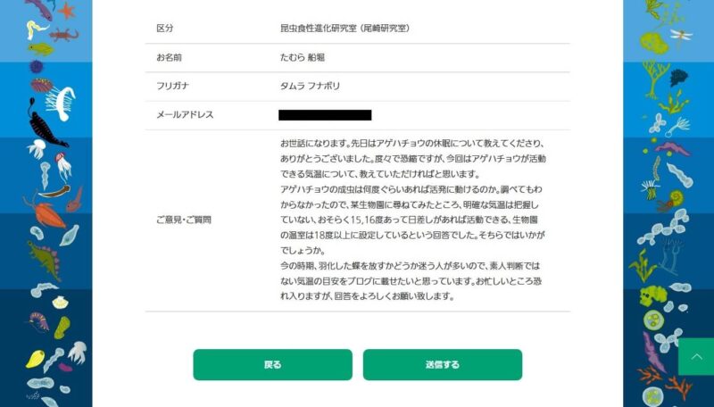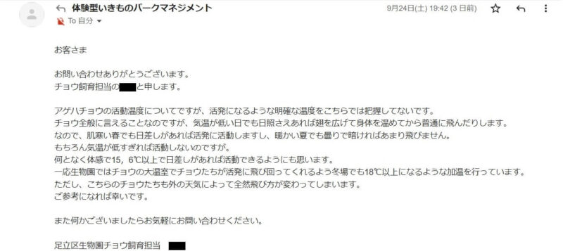 私が問い合わせたのは比較的近所の生物園と、当サイトに度々登場する研究機関です。両方とも回答(メール文)の掲載許可をいただいています。