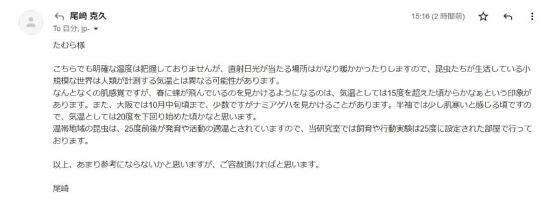 今の時期、羽化した蝶を放すかどうか迷う人が多いので、素人判断ではない気温の目安をブログに載せたいと思っています。お忙しいところ恐れ入りますが、回答をよろしくお願い致します。