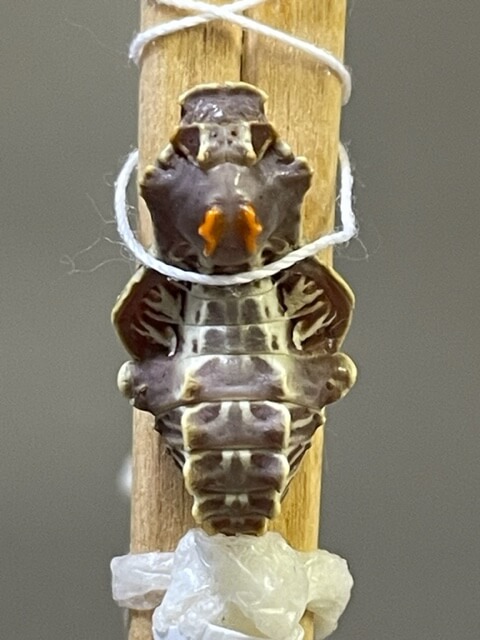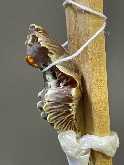 ジャコウアゲハの蛹は蛹ポケットに入れるのではなく、割り箸に固定します。蛹ポケットに入れると、羽化する時に脱け殻がなかなか取れなくてかわいそうなので。( 飼育日誌2010 )