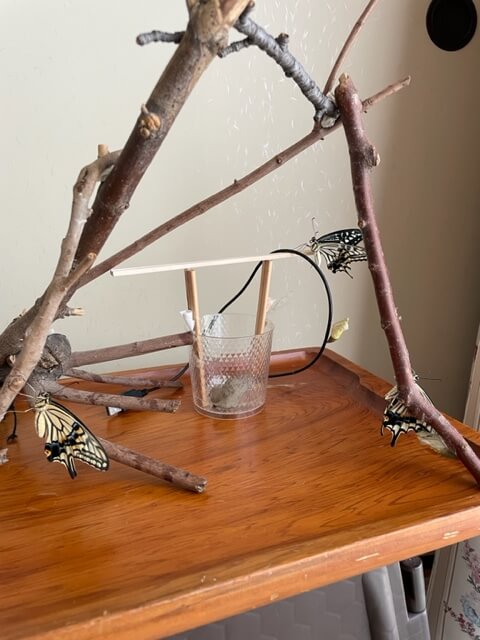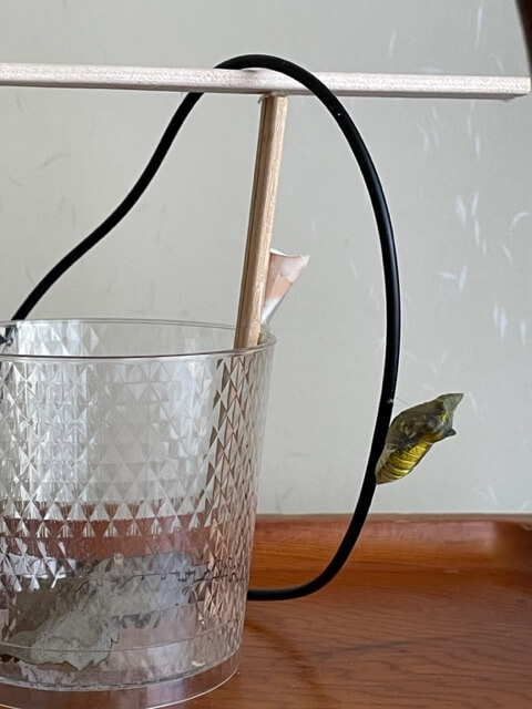 ■充電ケーブルに糸掛けした蛹が無事に羽化