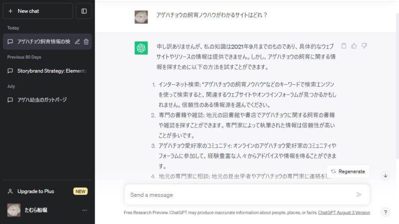 申し訳ありませんが、私の知識は2021年9月までのものであり、具体的なウェブサイトやリソースの情報は提供できません。しかし、アゲハチョウの飼育に関する情報を探すために以下の方法を試すことができます。・・・