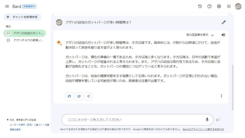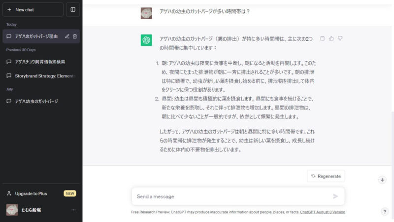 AIに尋ねてみました。質問は「アゲハの幼虫のガットパージが多い時間帯は?」。