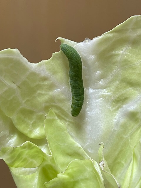無農薬のキャベツを置いておいたら、モンシロチョウの幼虫が這い出てきました。