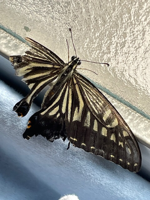 ぼろぼろな蝶。外にいたら、長生きはできないでしょう。