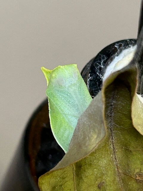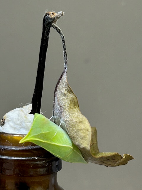 蛹になったのは12月5日。3週間経って、葉っぱは干からびましたが、糸でしっかり固定しているので、落ちません。( 飼育日誌1910 )