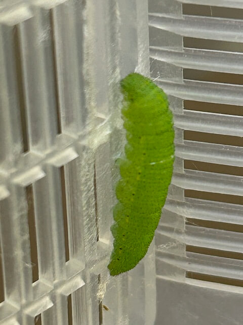 翌日1月11日の朝。飼育ケースのふたに定位、前蛹になっていました。